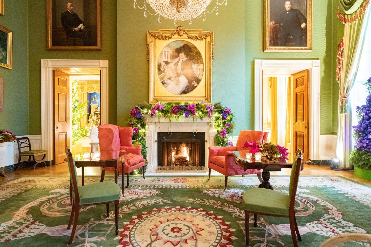 Os temas são ligeiramente distintos em cada sala. A State Dining Room, uma das mais badaladas nesse evento, tem uma árvore de Natal decorada dom fotos de familiares de ex-presidentes e meias listradas acima da lareira.