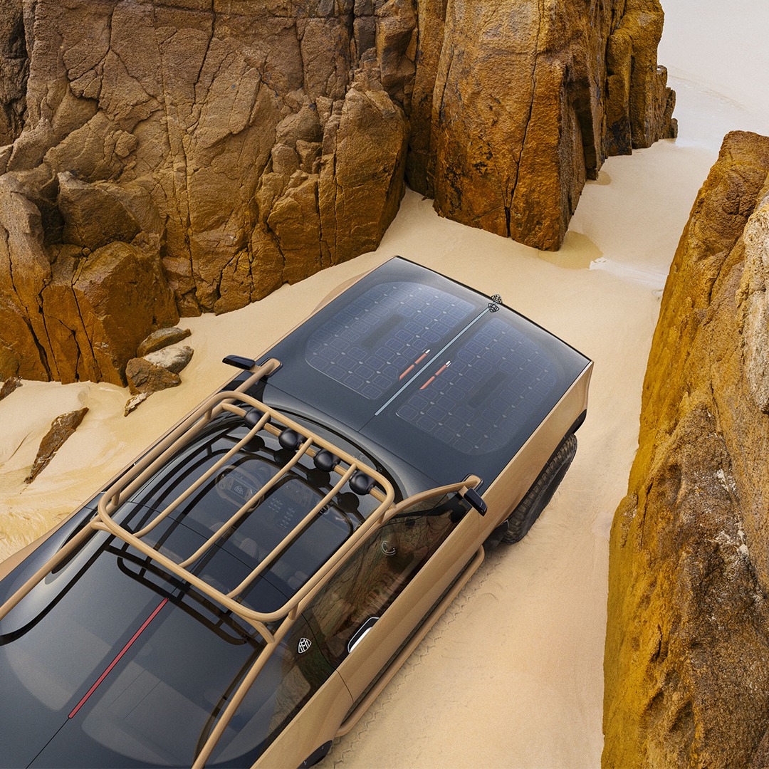 Os features de veículo off-road estão presentes – pneus especiais e barras de proteção – mas o carro parece com tudo menos com um SUV. No exterior, além do sistema elétrico, o carro também usufrui energia por meio de células fotovoltaicas quando exposto ao sol.