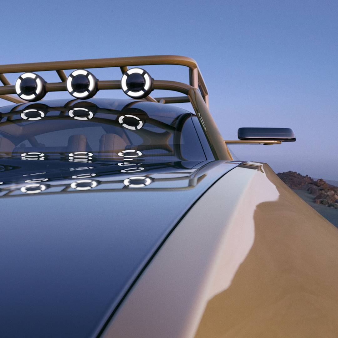 O carro parece um paradoxo em si. De porte agigantado, massivo, ele é um cupé elétrico de seis metros de comprimento e apenas duas portas – e foi pensado para o off-road.