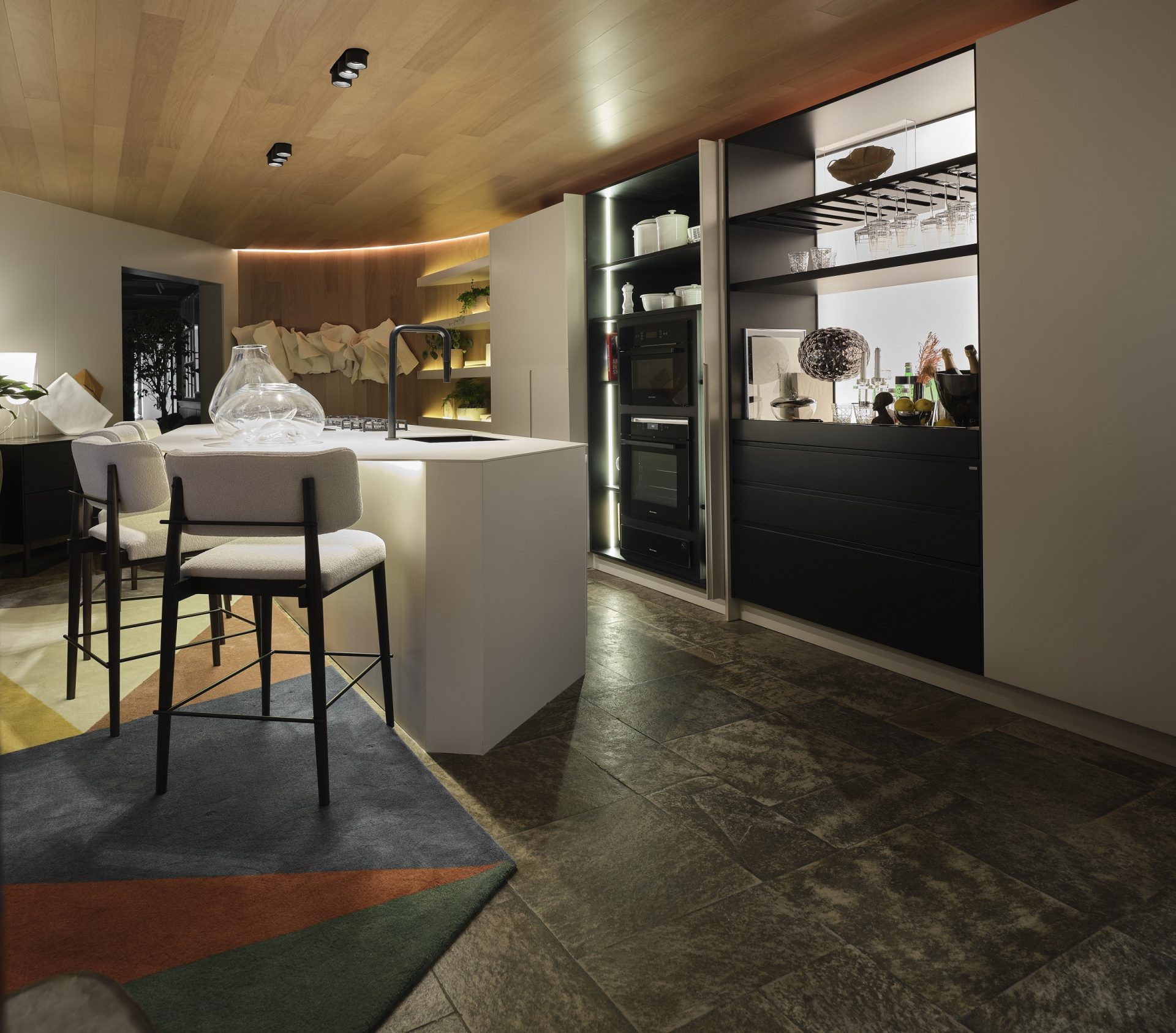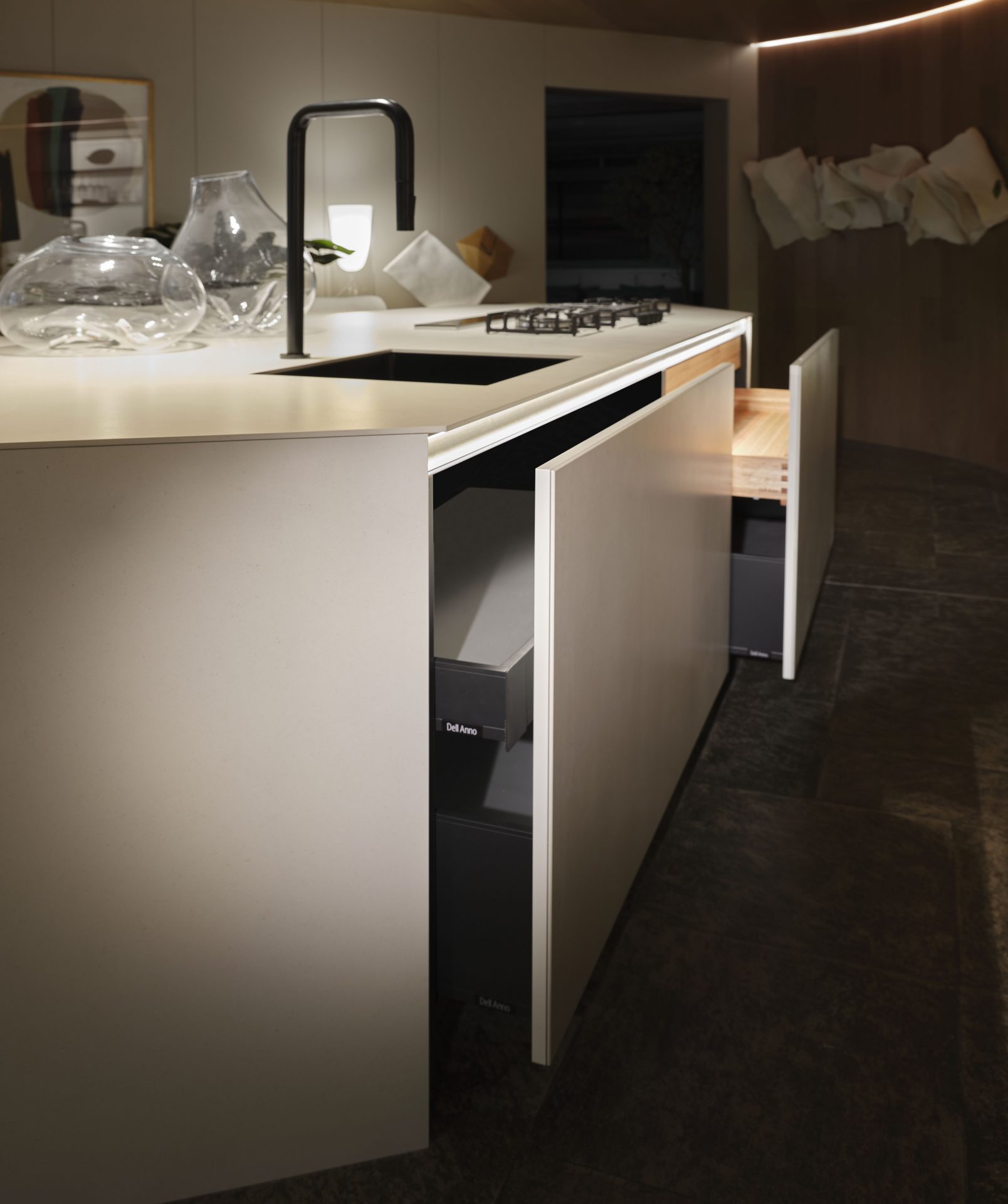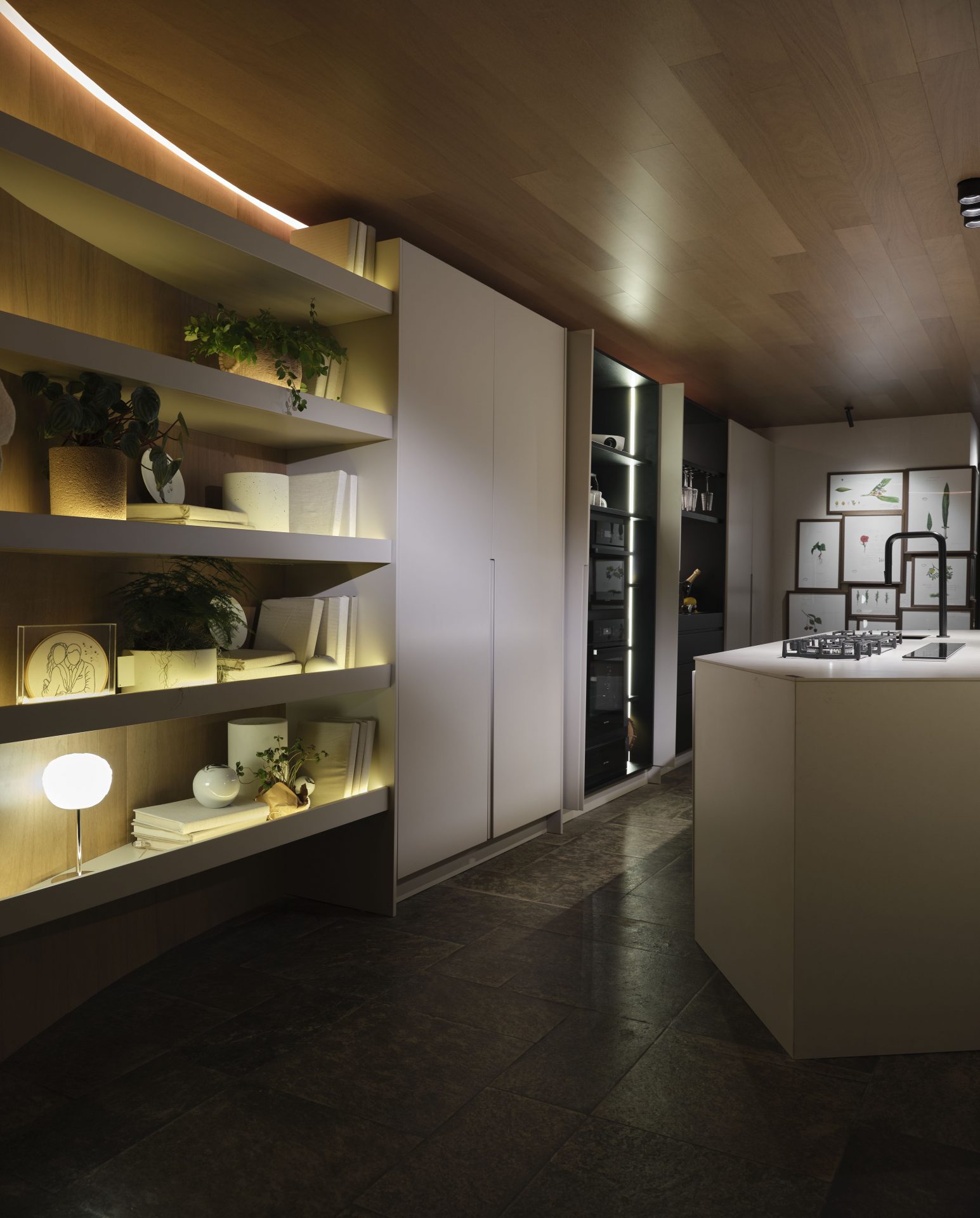 O espaço alma da casa conta com arte, design, culinária, enoteca, natureza e muita cor. A ilha em tom claro é o ponto central do ambiente, com bancada em Dekton e acabamento em Lacca Dune Dell Anno, além da iluminação em perfil Lefer, que gera uma luz difusa, garantindo um clima aconchegante. A cozinha é integrada de forma clean e harmônica, graças às portas com sistema escamoteável Dell Anno, também em Lacca Dune. Esta solução oculta eletrodomésticos e bancadas, ao mesmo tempo que permite a abertura completa, recolhendo as portas nas laterais e facilitando o acesso à parte interna na hora de cozinhar. Ao manter as portas abertas, o ambiente claro se transforma, quando a caixaria interna dos armários se revela em Lacca Notte, um tom escuro elegante e nobre.