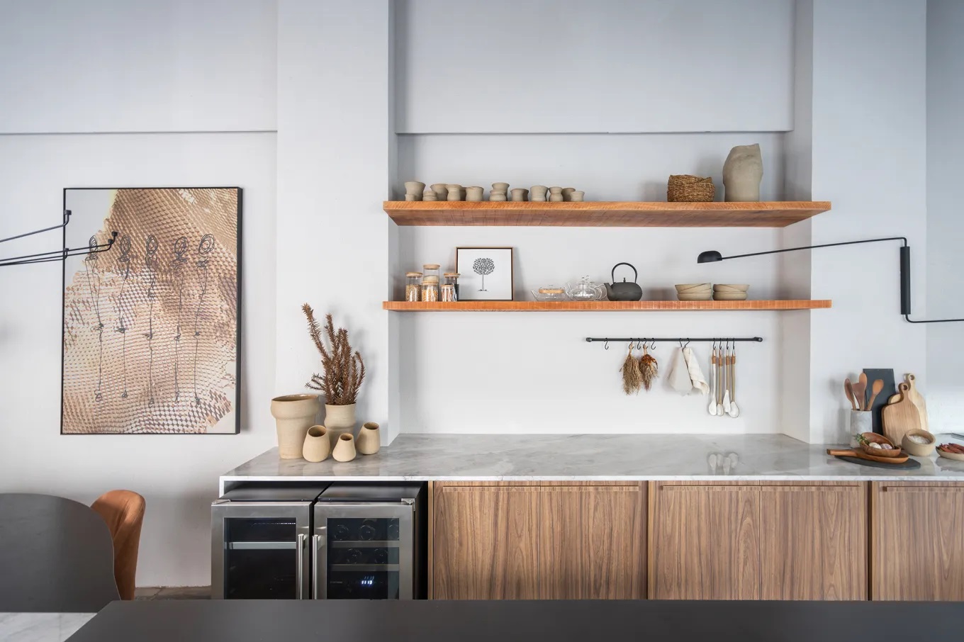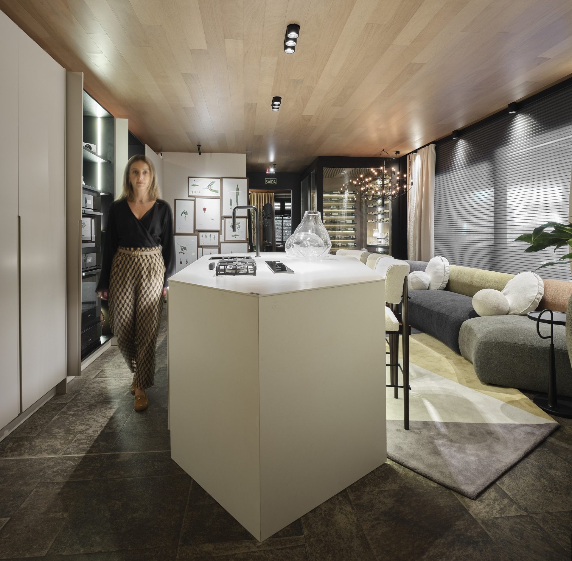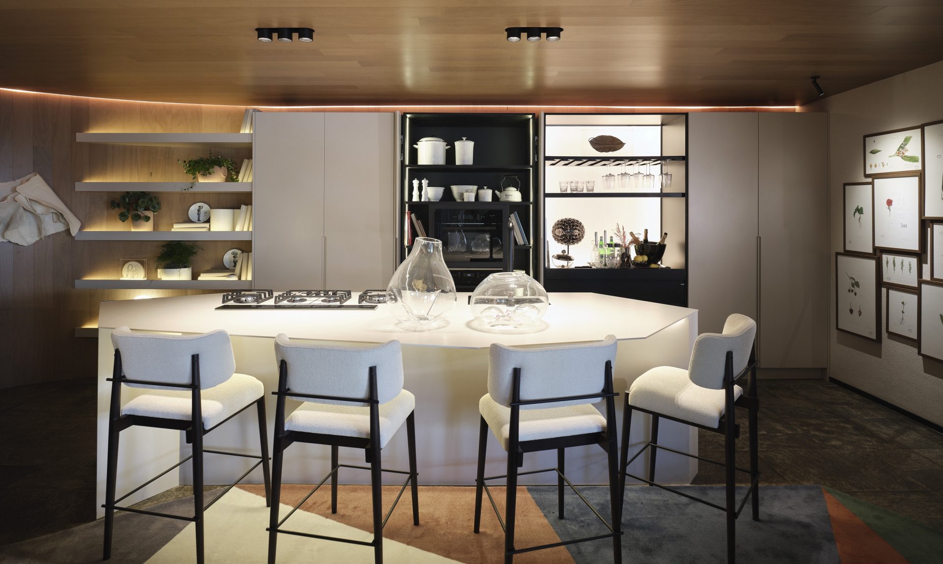 O espaço alma da casa conta com arte, design, culinária, enoteca, natureza e muita cor. A ilha em tom claro é o ponto central do ambiente, com bancada em Dekton e acabamento em Lacca Dune Dell Anno, além da iluminação em perfil Lefer, que gera uma luz difusa, garantindo um clima aconchegante. A cozinha é integrada de forma clean e harmônica, graças às portas com sistema escamoteável Dell Anno, também em Lacca Dune. Esta solução oculta eletrodomésticos e bancadas, ao mesmo tempo que permite a abertura completa, recolhendo as portas nas laterais e facilitando o acesso à parte interna na hora de cozinhar. Ao manter as portas abertas, o ambiente claro se transforma, quando a caixaria interna dos armários se revela em Lacca Notte, um tom escuro elegante e nobre.