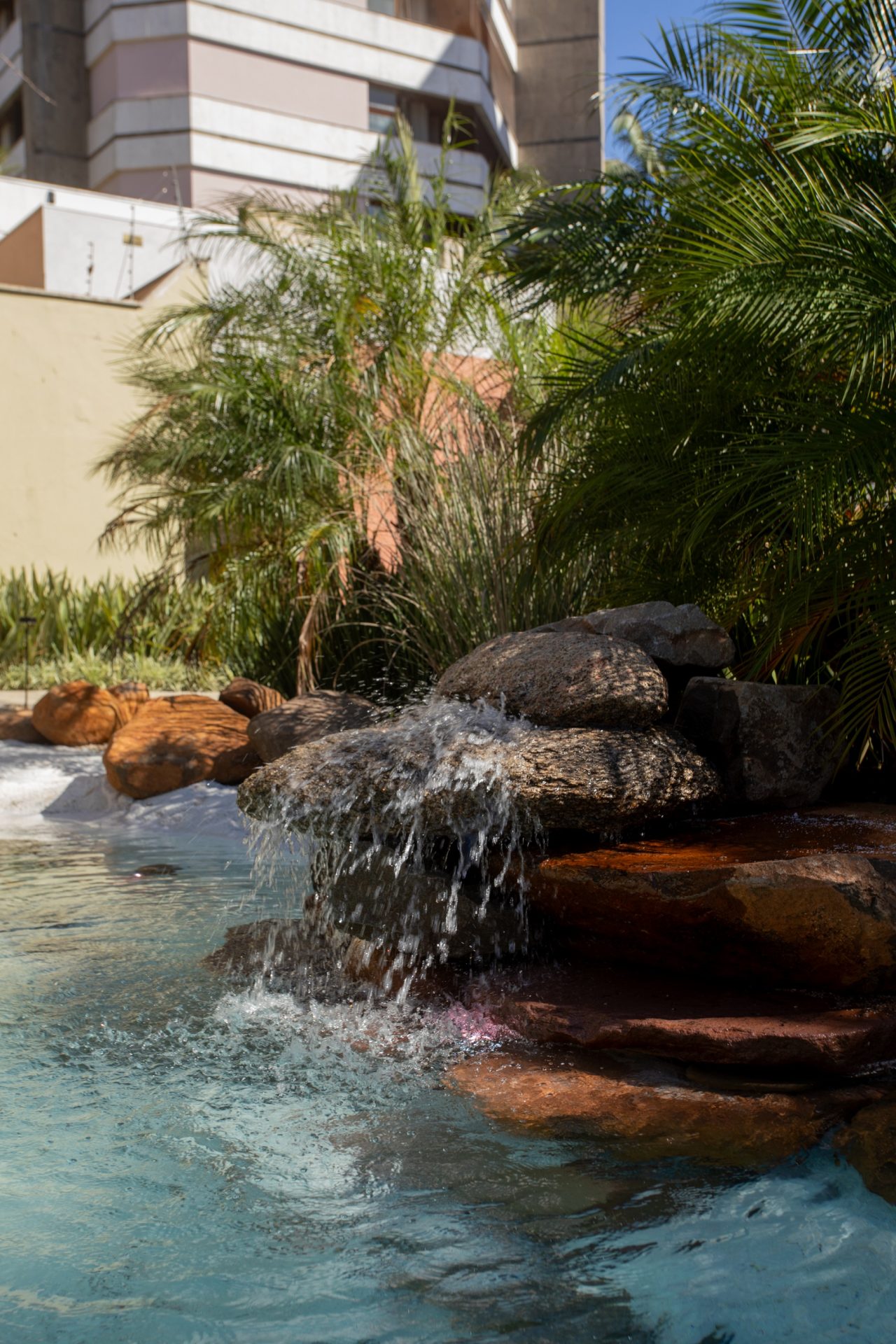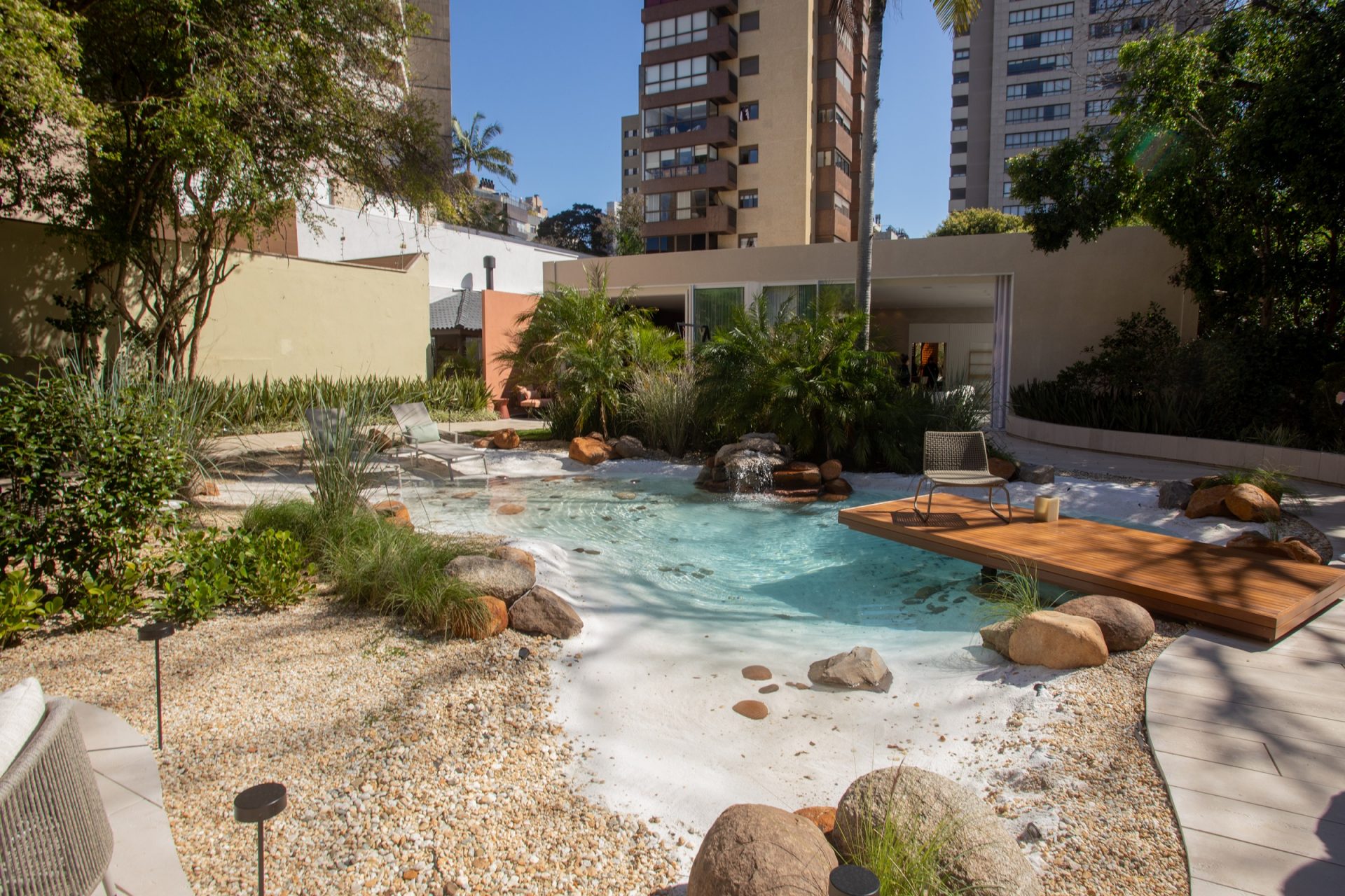 O conforto de uma piscina externa aquecida em qualquer época do ano é um sonho, principalmente para os moradores do Sul, e agora se torna mais acessível com a bomba de calor inverter da Komeco. A nova solução para aquecimento da piscina natural, com 80m² de areias brancas e pedras, ponto principal do ambiente de 400m² Pool Garden Hidrotec, criado pelo paisagista Fernando Thunm.