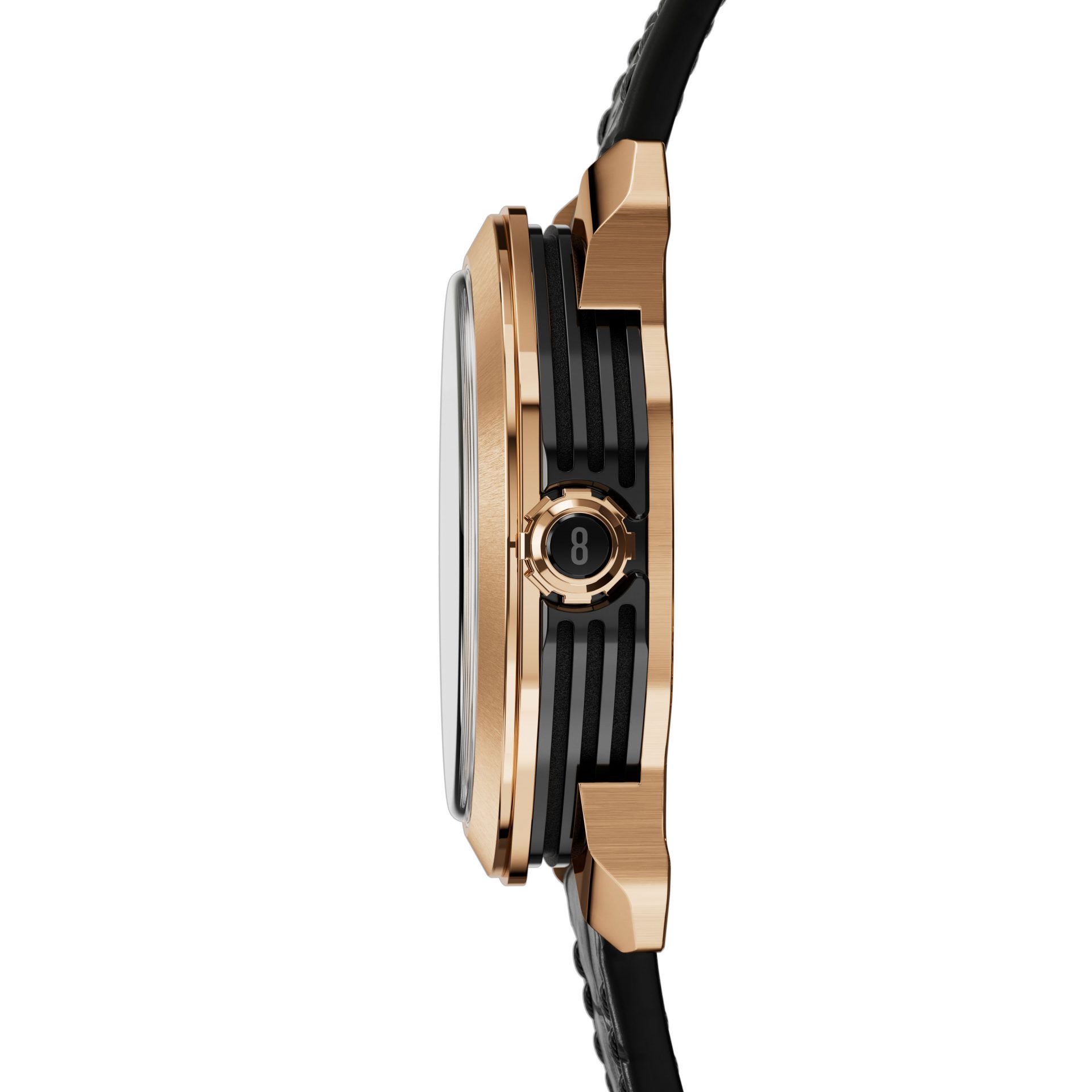 A edição limitada do Bvlgari Aluminium GMT x Fender® é uma homenagem ao 70º aniversário da icônica guitarra Stratocaster. Com um acabamento em degradê de tonalidades terrosas, este relógio une design e música em uma peça exclusiva.