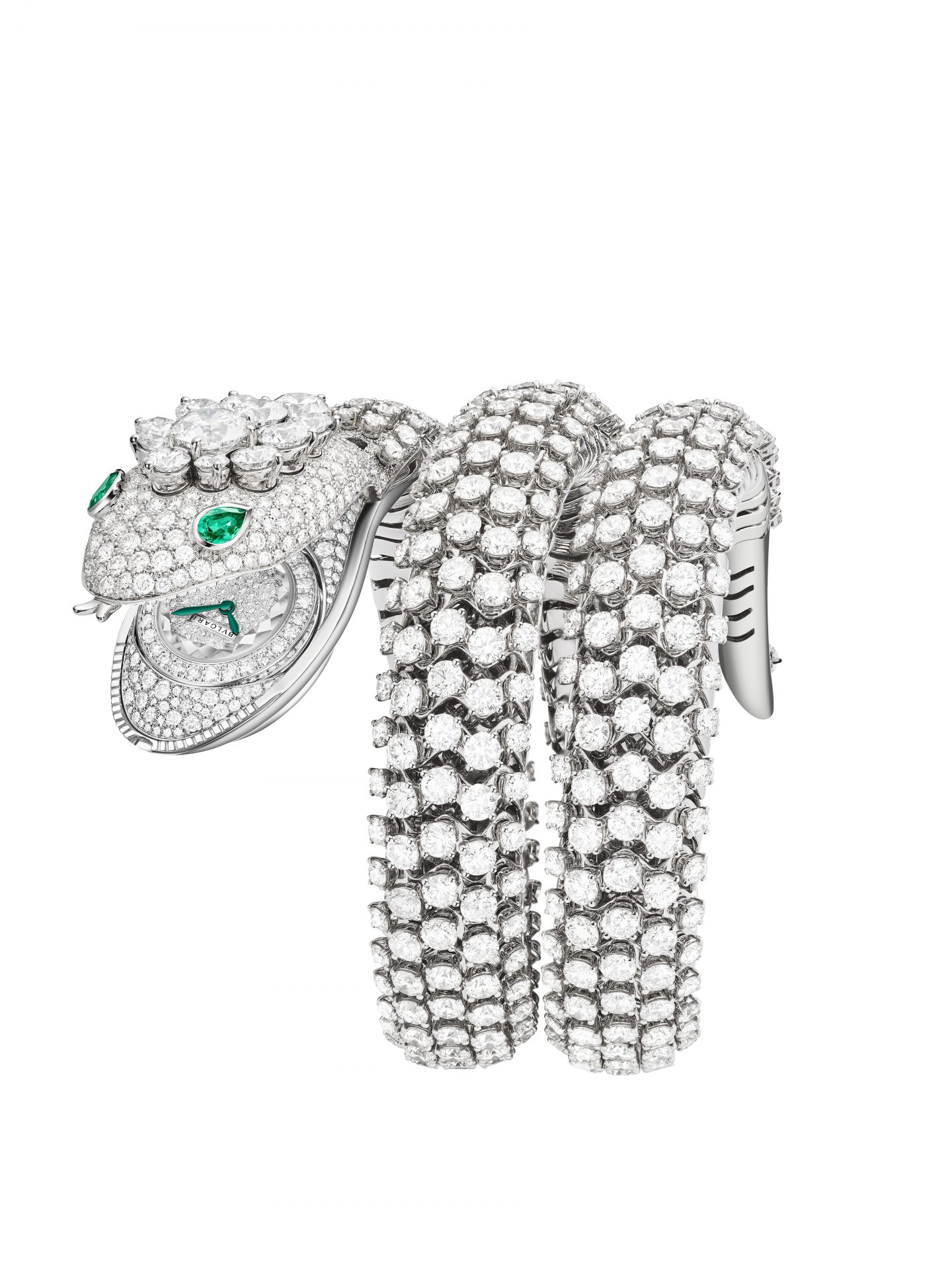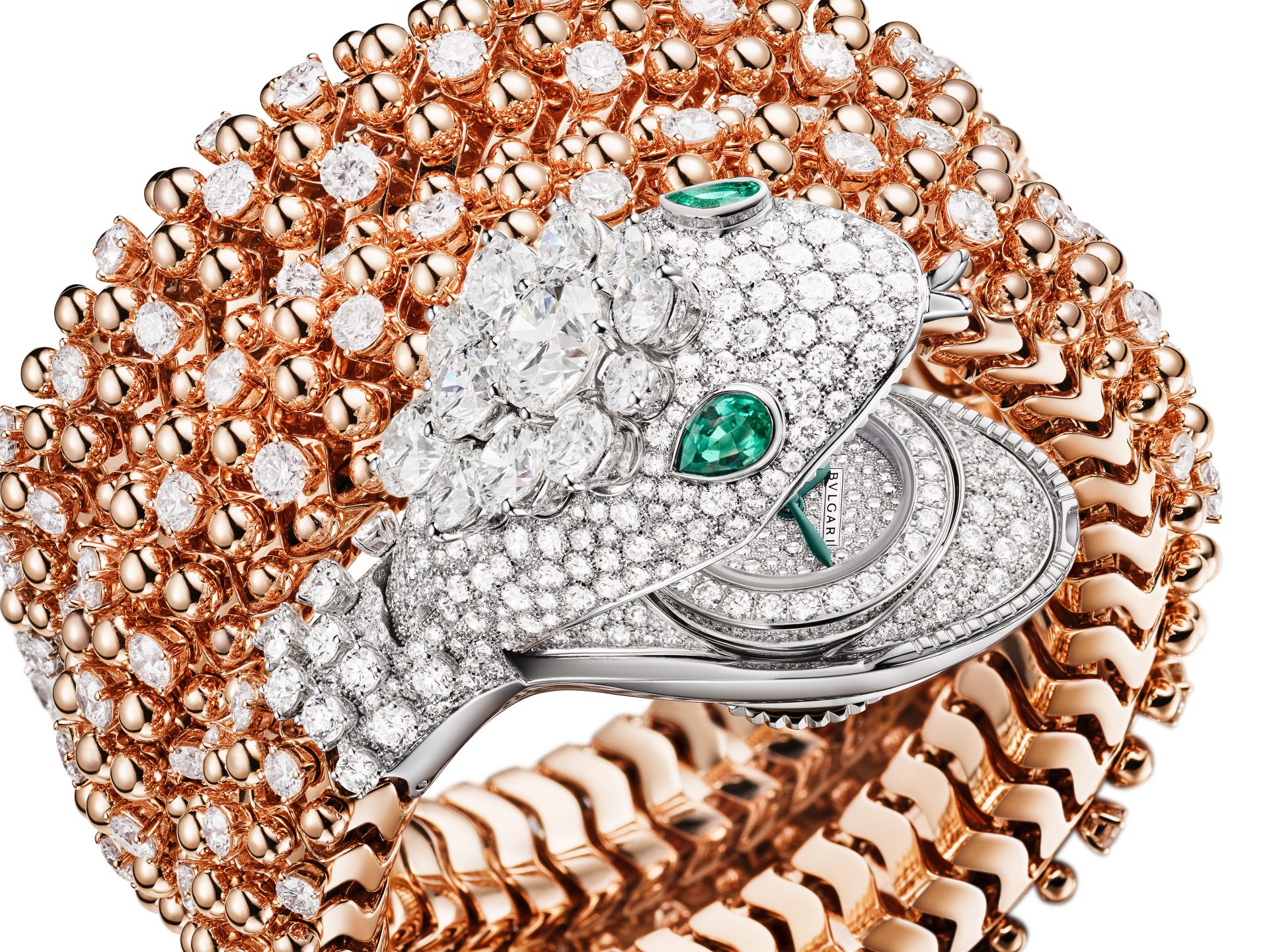 A nova coleção Serpenti Pallini demonstra a habilidade artesanal da Bvlgari, agora alimentada pelo micromovimento Piccolissimo. A técnica Pallini permite que cada conta preciosa se mova livremente, criando um efeito hipnotizante e fazendo do relógio uma verdadeira joia.