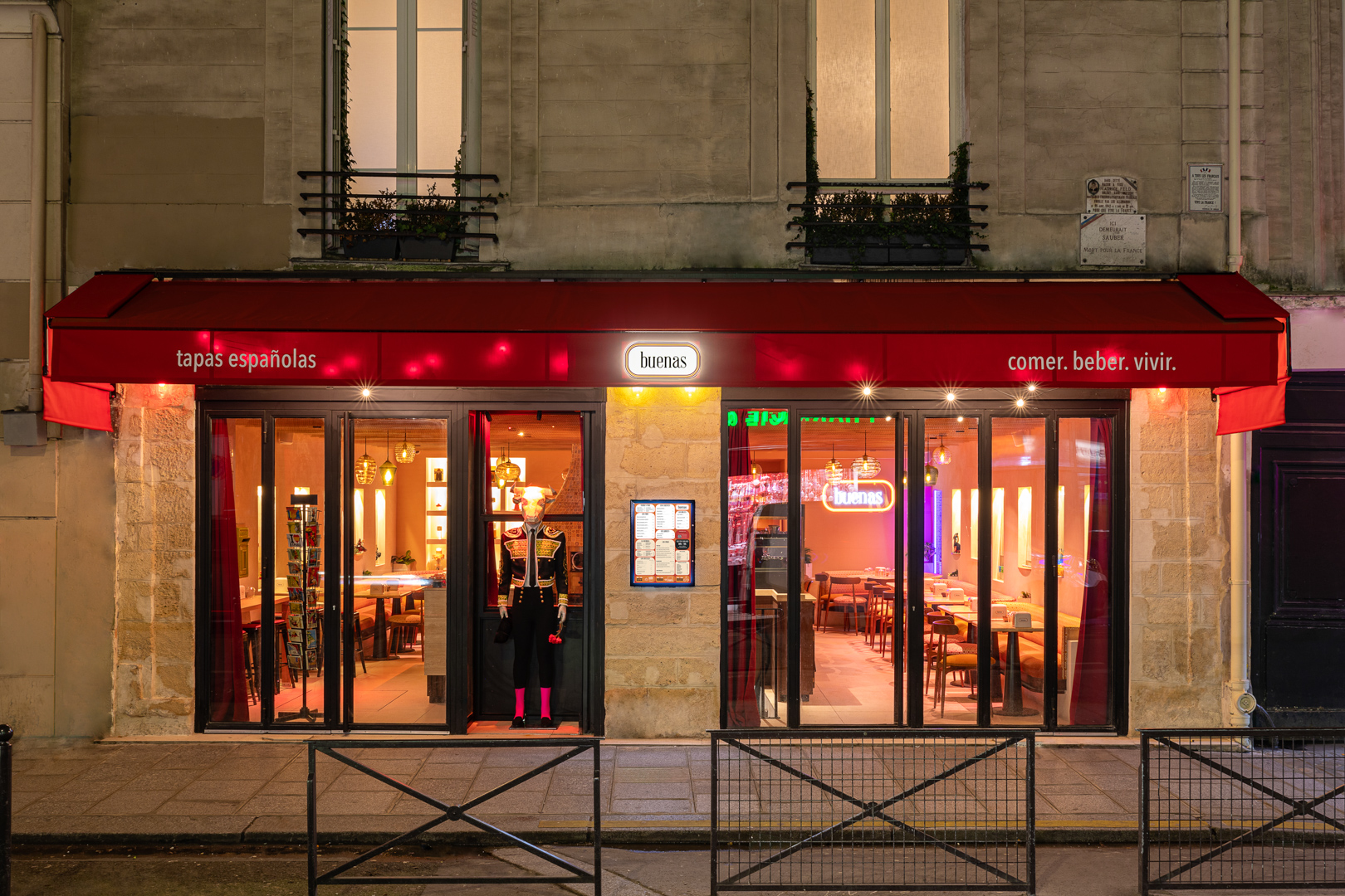 Localizado no 10º arrondissement, o Buenas é um restaurante espanhol que busca trazer a essência da vida espanhola para Paris. Com uma decoração colorida e vibrante, inspirada nos filmes de Pedro Almodóvar, o ambiente é descontraído e acolhedor. O proprietário, Toufik Seddik, é um apaixonado pela cultura espanhola e idealizou o espaço para que os clientes se sintam em casa. O cardápio apresenta uma variedade de tapas tradicionais e pratos que representam diversas regiões da Espanha. Entre as opções, destacam-se a tortilla com cebolas confitadas, pimientos de padrón, croquetas sazonais e uma seleção de pães artesanais acompanhados de sardinhas, cecina ou jamón. Para acompanhar, o Buenas oferece cervejas espanholas e uma variedade de bebidas típicas, como sangria e tinto de verano.