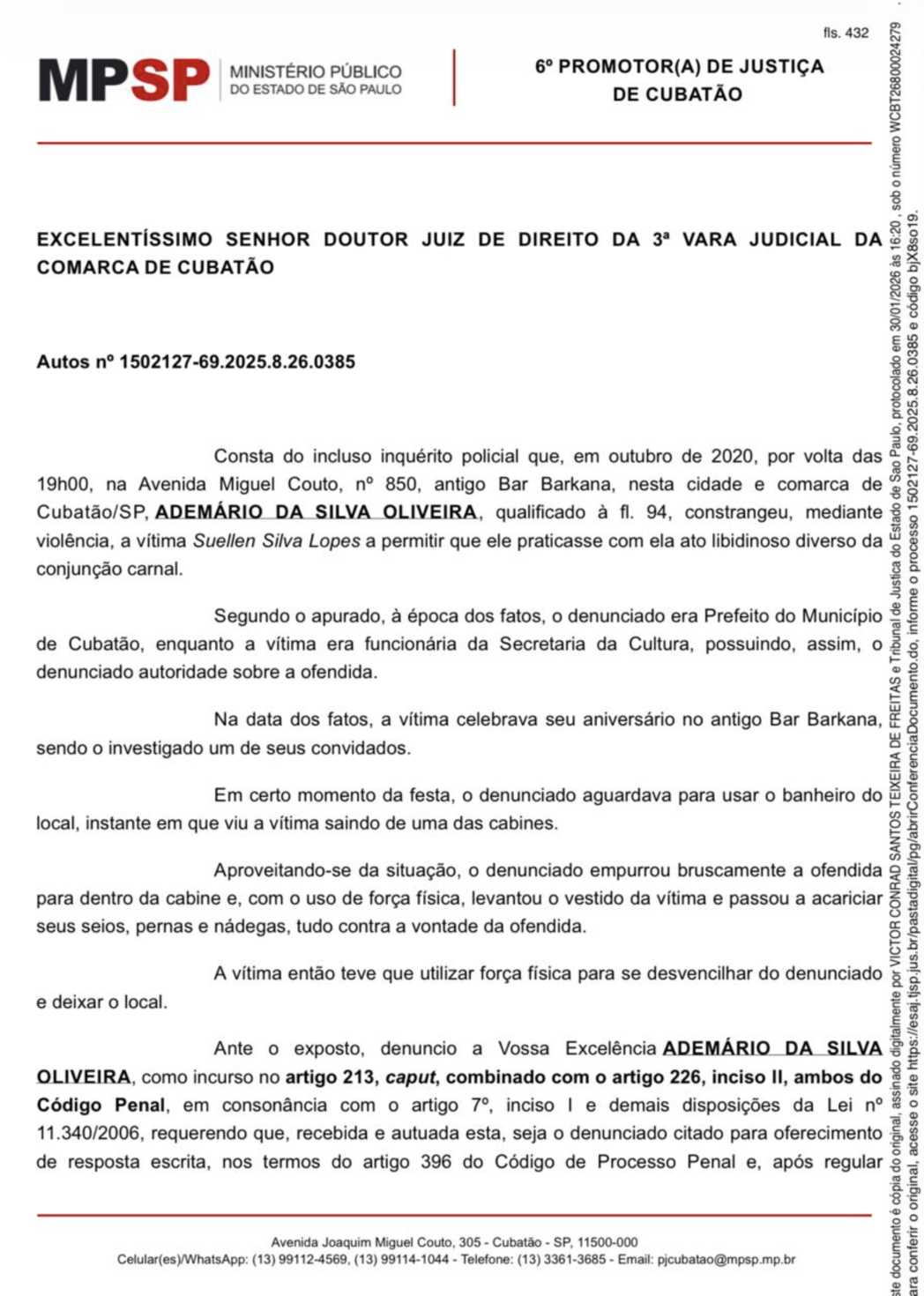 De acordo com documentos do MP-SP, divulgado com exclusividade pela CBN Santos, a acusação se refere a um episódio ocorrido durante uma festa de aniversário no antigo Bar Barkana, em Cubatão. A denúncia aponta que o então prefeito teria cometido o crime dentro do banheiro do estabelecimento, em um contexto em que, segundo a promotoria, a vítima era subordinada à administração municipal e vinculada à Secretaria de Cultura.
